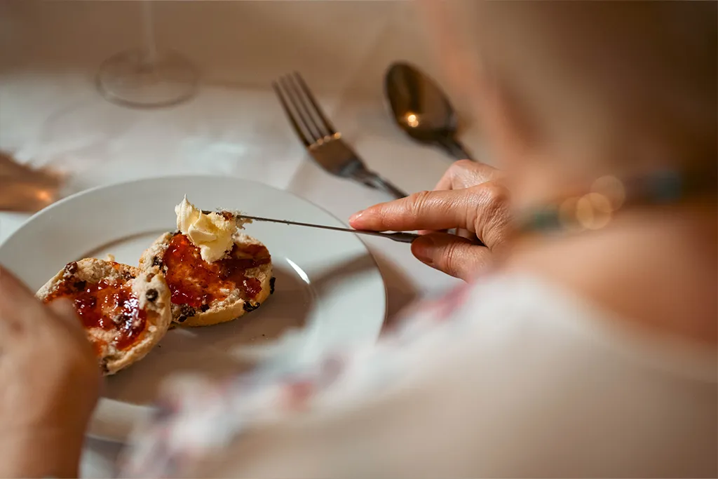 Treating yourself to our Classic Cream Tea, the perfect informal treat, with freshly baked scones, jam and clotted cream, ideal for a light indulgence.